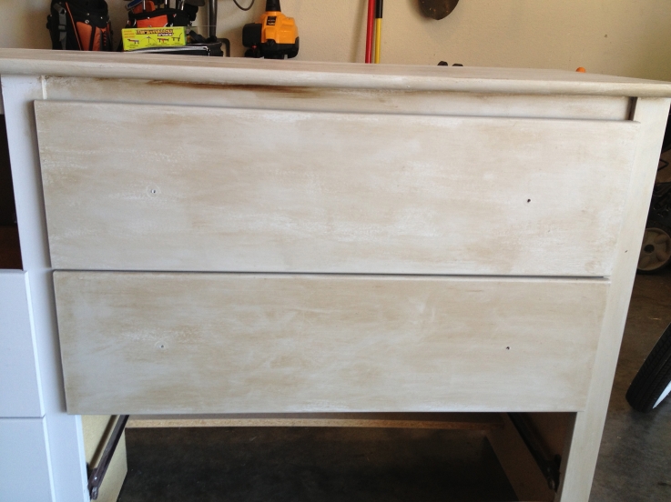 so i made a batch of chalk paint myself (mixing 5 tablespoons of plaster of paris and 2 tablespoons of water per 2 cups of paint) and repainted it. then i applied minwax clear finishing wax over it. here is the final result: